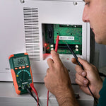 Multímetro de determinación automática del intervalo compacto con 11 funciones, incluida la temperatura Características: Pantalla digital grande de fácil lectura Voltaje y corriente CA/CD, resistencia, capacitancia, frecuencia, continuidad, prueba de...